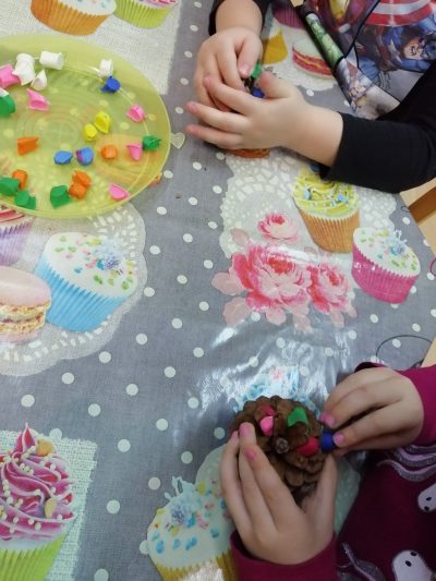 Izrađivali smo i božićne ukrase za bor od češera i plastelina. Djeca su od plastelina raznih boja radila kuglice i stavljala ih u češer. Kroz tu aktivnost razvijala su finu motoriku, oblikujući kuglice prstima, a i prepoznavala su i imenovala boje.